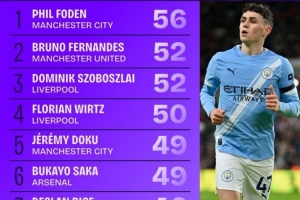 1、福登(曼城),56次