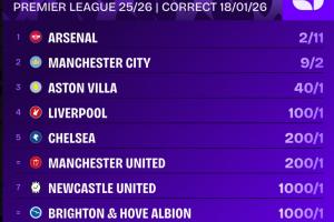体育资讯01月19日讯 维拉0-1不敌埃弗顿,本轮过后阿森纳虽然打平却扩大了领先优势。阿森纳目前以7分优势领跑英超,依然是夺冠的最大热门。