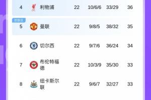 目前利物浦积36分位列第四,曼联1分之差紧随其后位列第五,之后是34分的切尔西、33分的布伦特福德、纽卡以及桑德兰,还有32分的埃弗顿,布莱顿本轮若赢球,也可能加入这一行列。
