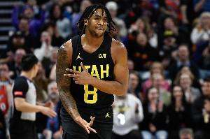 上半场,爵士球员森萨博状态火热,首节就拿下21分,半场不到就刷新赛季新高,在15分钟的时间里,投篮13中10,三分球6中4,罚球4中4,轰下28分1篮板2抢断的数据。